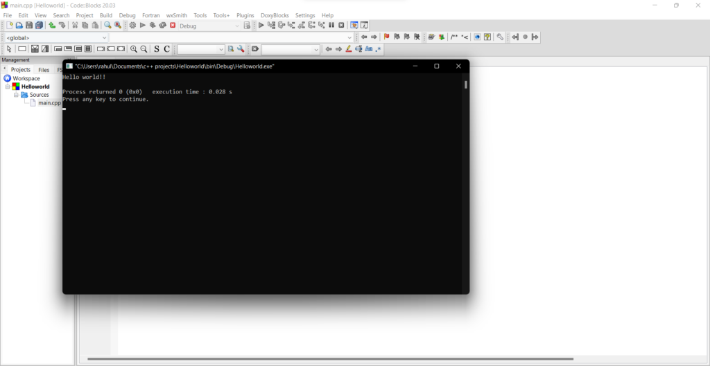 You will see that CodeBlocks has already created a sample helloworld code for our project. You can modify or replace it as you want.